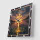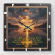 This incredibly moving and majestic design powerfully captures the central message of the Eternal Promise—salvation through belief. The artwork features a magnificent, golden Cross glowing brightly on a detailed rocky island at sunset, dramatically reflected in a calm expanse of water. This powerful imagery symbolizes the firm, unchanging foundation of faith. A prominent clock motif with dark hands overlays the scene, reminding the observer that God's love is timeless and everlasting. The design is presented with a high-quality, durable print that creates the striking illusion of a rich, dark wood grain frame surrounding the image, though this border is entirely a visual effect printed directly onto the clock face and is not a separate frame or real wood. The full text of the Christian message, "For God so loved the world, that he gave his only begotten Son, that whosoever believeth in him should not perish, but have eternal life. John 3:16." is inscribed on the image, making it an ultimate statement of belief.