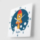 Un reloj de guardería o de dormitorio para niños fuera de este mundo. Este bonito diseño del espacio ultraterrestre presenta un cohete espacial que sale de las nubes. Espacio para un nombre personalizado, así que esto haría un fabuloso bebé de guardería o nieto de regalo. El fondo azul oscuro se puede cambiar a cualquier color.