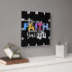 Contra un fondo negro oscuro, una estilizada cruz blanca se levanta, junto al mensaje impactante "DEJA QUE TU FE SEA MÁS GRANDE QUE TU MIEDO". La palabra "FE" se presenta en una mezcla de colores vibrantes y texturados (azul, amarillo, púrpura y rosa) mientras que "MIEDO" es un blanco atrevido y angustiado. El diseño general transmite un sentimiento motivador y espiritual.