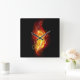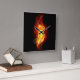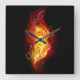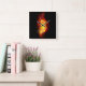 Una brillante pluma de pavo real hecha de fuego y llama sobre fondo negro.