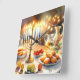 Ilustracion acuático Hanukkah. Una mesa muy bien arreglada para una celebración festiva, con una menorah tradicional con velas encendidas. La luz es suave y cálida, mientras que la decoración de las vacaciones aporta un toque de alegría. Las luces cálidas crean un ambiente acogedor y acogedor.