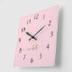Reloj de pared cuadrado personalizado minimalista femenino rosa con nombre monograma en letra dorada. Estos diseños presentan su primer nombre en una hermosa tipografía de letra manuscrita con florituras en color dorado sobre un fondo de color rosa bebé claro o rosa rosado. Fácil de personalizar. Un regalo femenino y elegante para la inauguración de una casa, también para cumpleaños, despedida de soltera, día de la madre, boda, fiesta de cumpleaños de 16 años y baby shower, graduación y es para la chica que ama cosas únicas y elegantes con brillo.