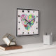 A clock with an illustrated heart filled with flowers and leaves in pink, green and yellow colors.