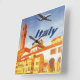 Afiche de viaje europeo de ilustracion vintage de Florencia, Florencia, Italia con la torre del reloj del Palazzo Vecchio (ayuntamiento) y un avión volando en el cielo. Un hombre está remando un bote bajo el Ponte Vecchio (conocido como el "Puente Viejo" en italiano). La bonita arquitectura de los edificios de la ciudad está al fondo.