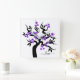 Flores moradas y aves amorosas reloj de pared de cerezo sakura negro. Cuenta con un árbol sakura negro con flores moradas con corazones negros en el centro y un par de pájaros amorosos. La palabra "Amor" está escrita en un tipo de letra de guión.