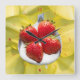 Hand placed, cut out yellow petals form the background for a spoon full of red strawberries and cream. Very very tasty!