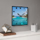A clock with a beautiful photo featuring a tropical beach resort.