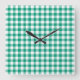 Un reloj de pared de diseño con un diseño de diseño clásico de color verde esmeralda y blanco de ladrillos gingham. Disponible en forma cuadrada y redonda.