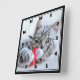 Un reloj cuadrado con una linda foto de Navidades de un gato gris manchado mordiendo juguetamente un sombrero rojo de santa. Sus grandes patas esponjosas hacen que esta foto sea extra deliciosa.