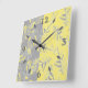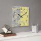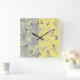 Reloj Cuadrado Hojas grises y amarillas en un fondo rayado.