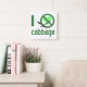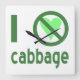 I hate cabbage. Design uses green letters, a green heart and the international "NO" sign to read , "I hate cabbage". For those that do not "heart" it, really dislike it, but have a sense of humor (humour), love to laugh and have their funny bone tickled.