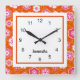 Este audaz patrón de poder floral viene en un reloj cuadrado de pared y está listo para su nombre personal. Repetir el estilo de la flor folclórica de los años 60 se crea en una paleta brillante de color rosa caliente, blanco y rojo naranja con un acento de fondo blanco, listo para editar el texto con el clic de un ratón. Buen regalo para un cuarto de adolescente o de interpolador.