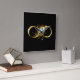 Oro, símbolo brillante de infinito, decorado con una pluma de pavo real de joyas con un fondo turquesa en negro.