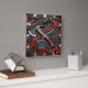 El hacha de un bombero de excelente factura descansa de forma prominente en un fondo vibrante lleno de patrones fluidos de rojo y negro.