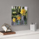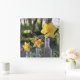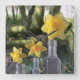 3 daffodils brillantes amarillos y naranjas de varias especies, se sostienen en 3 botellas británicas vintage, con un antiguo camino romano, el Fosse Way, como telón de fondo.