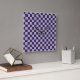 A vibrant checkered pattern with alternating black and lavender squares creates a bold, symmetrical grid. The design is balanced and visually striking.