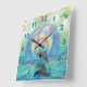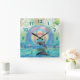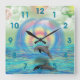 2 delfínes que nadan en el océano cerca de un levantamiento hermoso de colores y de agua con 2 planetas, una luna y un sol colorido. Colores rosados, azules, de la aguamarina, amarillos y verdes en el agua y el cielo.