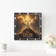 This powerful and evocative design captures the theme of the Light of Salvation—the divine foundation and hope offered through Christ. The artwork, featured on a square wall clock, displays a rugged, wooden-textured cross standing powerfully atop a rocky mountain summit. The cross is silhouetted against an intense golden sunburst that breaks through dramatic, dark clouds, symbolizing the light conquering darkness. The gold words "THE CROSS" are prominently featured at the base of the mountain. The core message of Christian faith is quoted from John 8:12: "I am the light of the world." This incredible image provides a spectacular visual representation of faith, serving as an inspiring timepiece and striking centerpiece for any faithful home or office, symbolizing eternal guidance and hope.