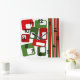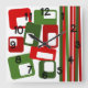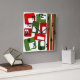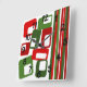 Este reloj de pared tiene un diseño Navidad moderno de mediados de siglo de líneas y rectángulos en tonos retro de rojo y verde.