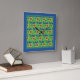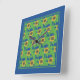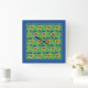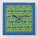 Reloj cuadrado de pared luminoso y atractivo, con un patrón de girasoles dorados amarillos sobre un fondo azul profundo, a partir de una imagen de Judy Adamson.