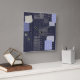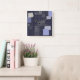 Reloj cuadrado azul oscuro en la pared con diseño impreso de sashiko japonés tradicional que se parece a puntos y parches.
