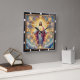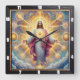 Este reloj cuadrado de pared presenta una imagen luminosa de Jesucristo con un corazón sagrado radiante, envuelto en un halo de luz dorada y patrones intrincados. Se alza entre nubes suaves con brazos extendidos, rodeado de un resplandor etéreo y orbas celestes, creando una profunda e inspiradora obra de arte religioso.