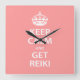 ¡Qué reloj para tu habitación reiki! Keep Calm and Get Reiki es un despegue del antiguo poster de la Segunda Guerra Mundial "Keep Calm and Carry On", colgado por todo Londres durante el Blitz. El texto es blanco y se puede cambiar el color de fondo a cualquier cosa.