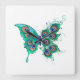 Mariposa pintada de forma artística, ficticia, verde, detallada, con plumas verdes, hermosas, de pavo real sobre fondo blanco.