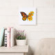 Naranja, mariposa monarca detallada con ala decorada con amapola californiana amarilla y vibrante sobre fondo blanco.