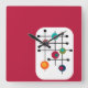 This wall clock has a mid-century modern design of a magenta rectangle with a white rectangle at the bottom with a black grid with retro circles on it.