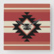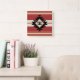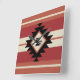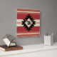 Modelo bohemio étnico azteca con formas geométricas en colores rojos, anaranjados, grises y negros en fondo rayado