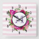 Reloj monogramado con tu inicial en el centro. Diseñado con un ramo de flores compuesto por rosas rosa claro y adornos rosa oscuro con muchas hojas verdes y exuberantes. Un marco se colocó encima para colocar el texto de su personalizado dentro. El fondo es una suave tónica rayada rosa pastel.