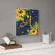 Añada un toque inicial para personalizar este elemento rústico de decoración casera con temática de girasoles. Los girasoles amarillo con hojas verdes de color verde se encuentran en un fondo azul marino oscuro con un patrón polkadot moderno. Gran idea de regalo para recién casados, aniversario o nuevos propietarios de casas.