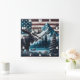 Un majestuoso alce se alza junto a un sereno lago, enmarcado por montañas y un telón de fondo de la bandera estadounidense, que captura un sentido de naturaleza y patriotismo.