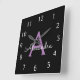 Reloj Cuadrado Morado Black Script Girly Monograma Nombre