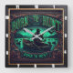 Este es un ilustracion estilizado con una textura de cuero labrado y un tema de caza. Cuenta con un hombre en un bote en un lago oscuro, sosteniendo un rifle y rodeado de patos. El fondo incluye montañas y un cielo brillante, todo representado en una paleta de color neón oscuro de verde azulado y naranja. La frase "NACIDO A HUNT" se muestra de forma prominente tanto en la parte superior como en la parte inferior de la obra.