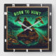 Un ilustracion estilizado y vibrante cuenta con un cazador en un bote, rodeado de patos en un lago. La obra de arte tiene una textura de cuero labrado distinta y se representa en una paleta única de verde neón, azul y marrón. La frase "NACIDO A HUNT" enmarca la imagen central.