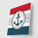 Nautical design with anchor decoration in round shape on blue, red, grey and white striped background