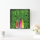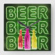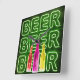 Reloj cuadrado en la pared impreso con el signo de la barra de aspecto de neón. El diseño tiene botellas de cerveza de color y está escrito con la palabra BEER en iluminación LED. Tiene una paleta de colores verde, rojo, rosa y amarillo. Por favor, navegue por nuestra tienda en busca de colorantes alternativos.