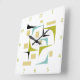 Añade un toque de color a tu pared con este divertido reloj moderno de mediados de siglo. Los colores de las formas geométricas azul acuático, verde aguacate, amarillo y negro se combinan con los números verdes correspondientes.