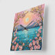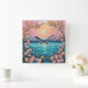 Paisaje sereno realzado por colores vibrantes y detalles intrincados. En el centro, una luna llena brilla suavemente contra un cielo pastel que transita del rosa al melocotón. Flanqueando la luna hay montañas distantes que añaden profundidad a la escena.