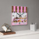 Un ilustracion lindo del arte de una ventana de la panadería. Una variedad de postres están en la exhibición incluyendo un buñuelo, las galletas, los daneses, rollo de canela, la empanada, el eclair, los chocolates y los caramelos. El tema del color es sobre todo rosado y marrón. Este diseño está también disponible en azul y marrón. Esta funciona increíble caprichosa del reloj de pared para una pared, una panadería o un café de la cocina. Ilustraciones por Delicioso-Doodles.