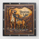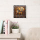 This highly dimensional square wall clock features a bold, close-up illustration of a brown panther (or leopard) and a white, happy goat standing side-by-side. The entire design is rendered in muted brown, tan, and dark leather-like tones, strongly suggesting a deep sculpted relief or Sculpted Leather Look. The panther has detailed spots and is positioned on the left, while the goat is on the right, smiling with large curved horns. They are surrounded by an elaborate wreath of gnarled, dark tree roots and branches carved into the perimeter. The background is a dark leather panel with heavy texture. The large, three-dimensional embossed text "BESTIES FOR LIFE" is carved across the top center in a bold, golden serif font. The clock face features a simple clock face border with large, white, numbered tick marks (1 to 12) integrated into the outer frame. The artwork is surrounded by a thick, dark brown decorative border that resembles a black wood frame.
