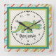Personalice este colorido reloj cuadrado en la pared que incluye una bonita tricerotops para una habitación especial para niños. Simplemente edite su nombre en el sencillo editor de texto Zazzle con un simple paso. Creado en acentos de color verde, verde azulado, naranja y negro.