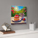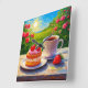Esta pintura representa una tarde tranquila y relajada llena de dulces momentos de postre 🍓 🍰 ☕. Como telón de fondo, un cielo azul claro y un sol cálido brillan, mientras que flores rosas y rojas están en plena floración, mostrando la belleza de la naturaleza. Sobre la mesa de madera, un pastel de fresa con dos fresas frescas como relleno sobre un plato blanco y, al lado, una taza de café con una taza blanca de porcelana con un platillo. Una fresa fresca sobre la mesa aporta un toque de frescura a la escena. La obra de arte, con sus bruscas pinceladas, ofrece textura y profundidad, aportando colores vivos a la vida. Trae una sensación de paz y felicidad a quienes la ven. A través de este artículo, espero que muchas personas puedan tomarse un momento para relajarse y refrescarse de sus vidas ocupadas. Es mi deseo que esta pintura añada un poco de felicidad y paz a tu vida. 🙏 ❤️