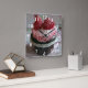 Foto de un delicioso quequito de chocolate con helado rosa. Dos frambuesas descansan encima. Un delicioso postre dulce, ¿quién puede resistir?