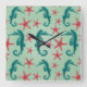 Reloj Cuadrado Patrón de caballitos de mar verde azulados 2