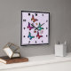 Un reloj Diseñado con un patrón elegante con un ilustracion gráfico de mariposas que revolotean en muchos colores brillantes, colocado sobre fondo de color rosa de agua. Flores, estribos y hojas caprichosas añaden un poco de encanto.