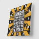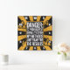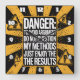 Este audaz y humorístico signo de advertencia muestra "PELIGRO:" en un panel negro central, rodeado por un fondo radial a rayas de color amarillo y negro angustiado. El texto enérgico dice: "PARA EVITAR EL ARGUMENTO / NO CUESTIONAR / MIS MÉTODOS / JUSTO DISFRUTAR DE LOS / LOS RESULTADOS". Los triángulos de advertencia con calaveras, signos de interrogación y puntos de exclamación refuerzan su temerario mensaje sin sentido.