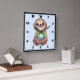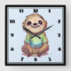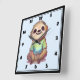 Un reloj con una ilustración adorable que presenta a un perezoso con aspecto feliz que lleva una camiseta verde. Sentado con las piernas cruzadas en una pose de meditación relajada.